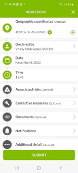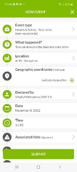 Similar questions: How to report an event in the Web module? Under the term Event we should understand environmental, health and safety incidents, near misses, assets damage and hazard observations. List of types of events may be fully modified to ...