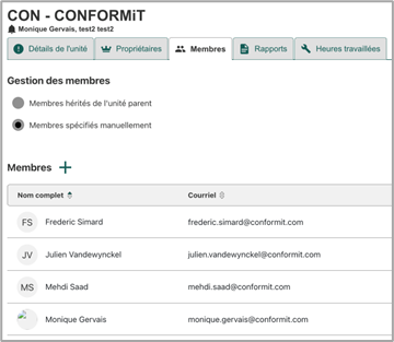 · Définir les membres* (voir encadré ci-bas) pour chaque unité organisationnelle. Décider si ces membres sont hérités ou spécifiés manuellement.