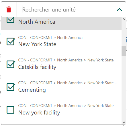 Par défaut, les tableaux de bord présentent les données de toutes les unités qui constituent la structure organisationnelle. Les filtres permettent de sélectionner les données pour lesquelles les unités seront présentées sur le graphique. À noter que les paramètres des filtres sont conservés et ce même si l’utilisateur se connecte et se reconnecte. Le filtre reste en place jusqu'à ce qu'il soit modifié ou supprimé par l'utilisateur. Les données exportées dans les tableaux Excel incluront uniquement des informations pour les unités sélectionnées uniquement. Aller dans le module et sélectionner