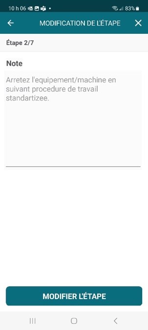 Veuillez noter que les corrections et les modifications apportées à la procédure dans l'application mobile Interventions n'affectent pas la version de référence. La prochaine fois que quelqu'un utilisera cette même procédure, elle arrivera dans un format inchangé sans les corrections ou les notes apportées par quelqu'un lors de l'intervention. Par conséquent, les modifications apportées dans l'application mobile s'appliquent uniquement au cas actuel de cadenassage. Si on constate une faute d'orthographe dans une certaine étape de la procédure, sélectionner le bouton en bas de la page qui ouvrira une permettant la sélection du type de corrections que l'utilisateur souhaite apporter.