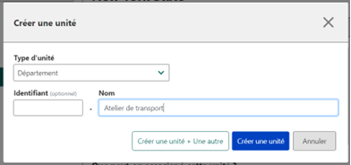 Choisir le Type d'unité, taper le nom et l'Identifiant, si nécessaire, dans la fenêtre qui s'affiche et cliquer sur