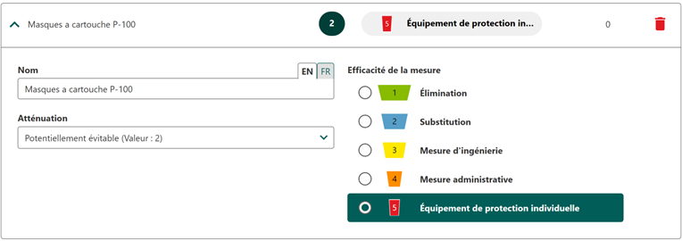 Les valeurs d'efficacité est alignée avec la hiérarchie des contrôles adoptée par la plupart des industries et approuvée par les autorités (y compris le CDC et l'Institut national pour la sécurité et la santé au travail) Une nouvelle mesure de contrôle apparaîtra dans la liste et pourra désormais être sélectionnée lors de la sélection des mesure d’atténuation. Elles peuvent également être consultées dans la liste pour être modifié ou supprimé