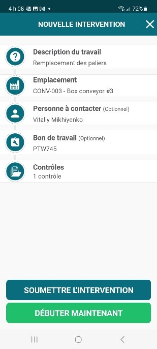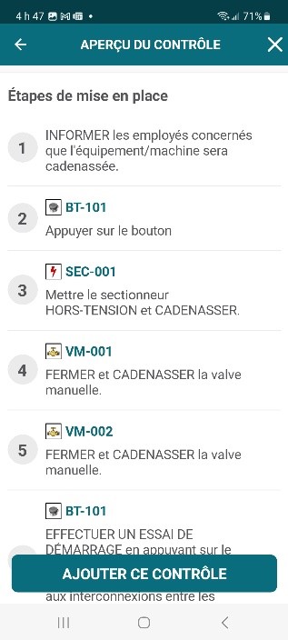 La sélection de Commencer maintenant, invitera l’utilisateur à 1st étape de la procédure de cadenassage. Après avoir sélectionné : Soumettre l'intervention – la procédure apparaîtra dans la liste des interventions avec le statut : Prêt à mettre en œuvre