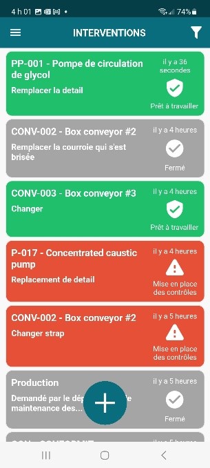 La procédure d'intervention peut être lancée pour le cadenassage à exécuter immédiatement ou à préparer à l'avance pour le cadenassage qui sera effectuée ultérieurement. Les personnes ayant accès à l'application d'intervention ont toutes le droit de lancer une nouvelle intervention et d'en exécuter les étapes. Sur la première page contenant la liste de toutes les interventions, cliquer sur pour commencer une nouvelle intervention (cadenassage de la machine). Sélectionner l'unité machine à laquelle vous devez appliquer le cadenassage et cliquer sur