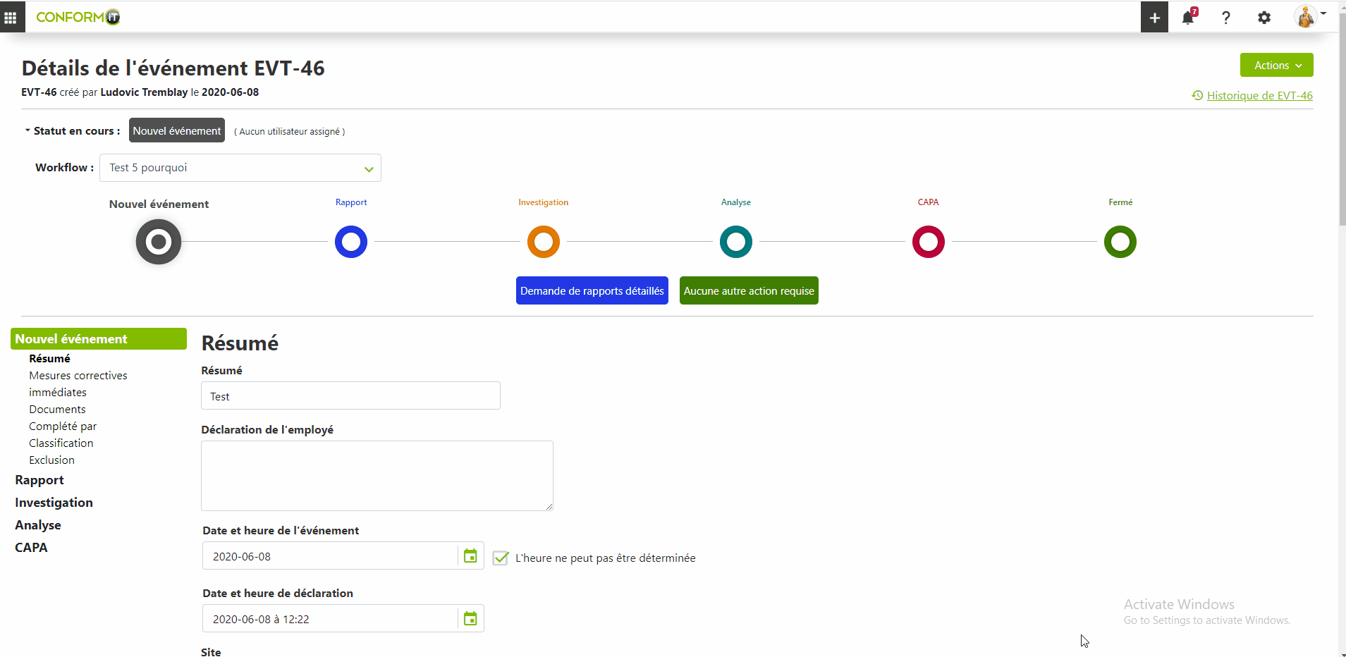 Questions similaires : Comment ouvrir un événement ? Comment afficher un événement ? Lorsque un événement est créé, il possible pour tout utilisateur de CONFORMiT d’ouvrir celui-ci pour le en consulter les informations (il est aussi possible de le ...