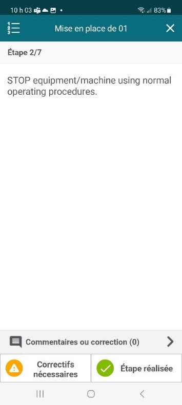 Veuillez noter que les corrections et les modifications apportées à la procédure dans l'application mobile Interventions n'affectent pas la version de référence. La prochaine fois que quelqu'un utilisera cette même procédure, elle arrivera dans un format inchangé sans les corrections ou les notes apportées par quelqu'un lors de l'intervention. Par conséquent, les modifications apportées dans l'application mobile s'appliquent uniquement au cas actuel de cadenassage. Si un dispositif erroné est mentionné à une étape de la procédure, sélectionner le bouton en bas de la page qui ouvrira une page permettant de sélectionner le type de corrections que l'utilisateur souhaite apporter.