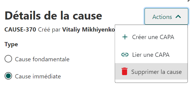 apparaîtra au-dessus. En cliquant sur ce bouton, la fenêtre des détails de la cause s’ouvrira où il est possible de la supprimer à partir du bouton Actions dans le coin supérieur droit.