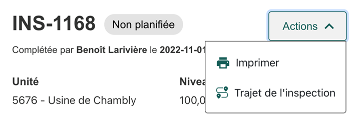 - Dans la fenêtre détaillée de l’inspection, il faut cliquer sur le bouton Actions et sélectionner l’option Trajet d’inspection