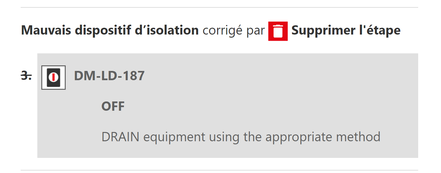 - Cochet qui signifie que les contrôles ont été mis en œuvre (apparaît une fois que la section de la procédure, telle que l'isolement ou la remise en service est terminée)