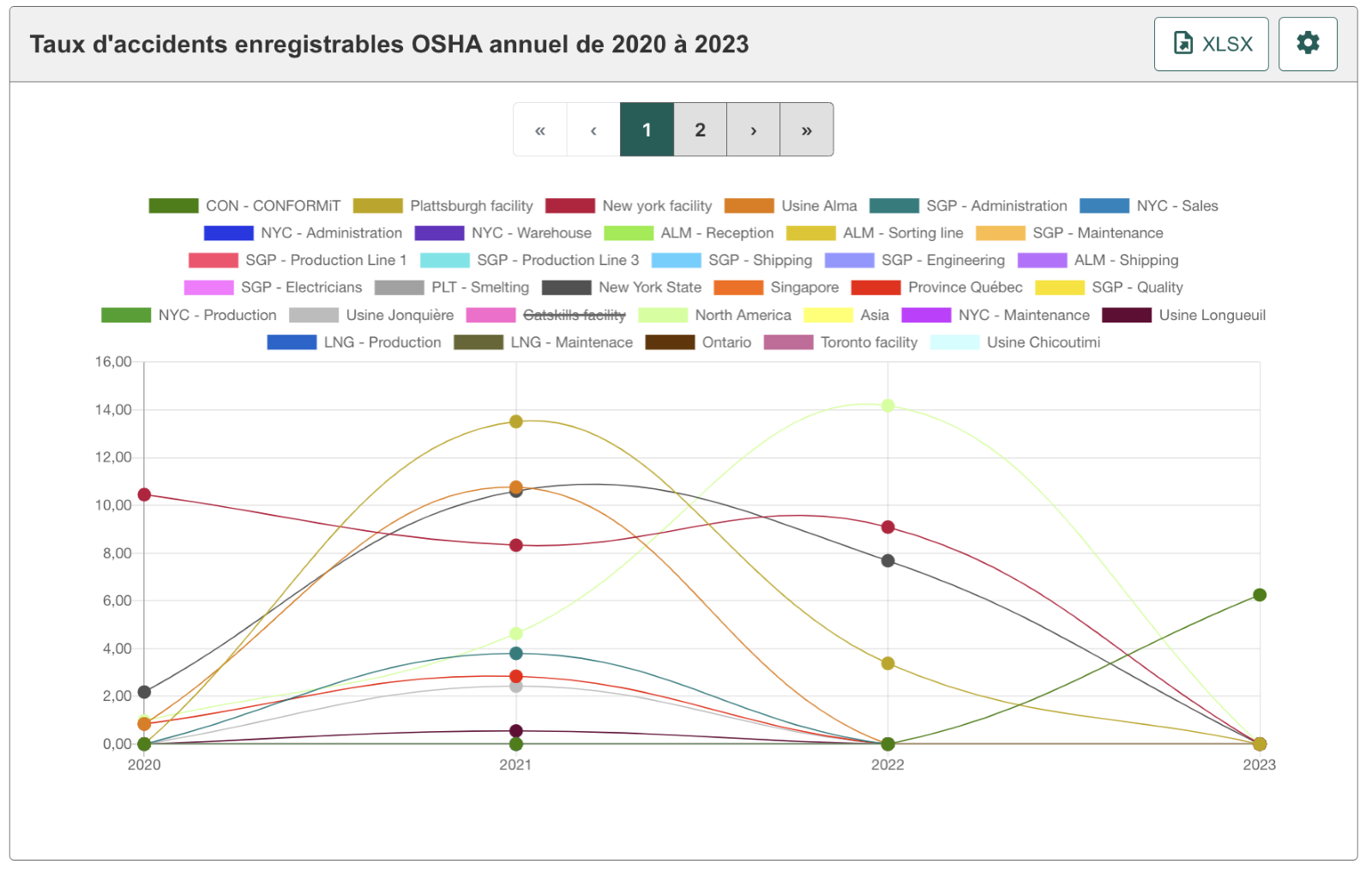 Dans le tableau de bord, afin d'obtenir le graphique pour le taux OSHA, il est nécessaire que les heures travaillées soient téléchargées dans le tableau des heures travaillées et ce, pour toutes les unités et pour les années pertinentes pour lesquelles on souhaite obtenir des taux d’incidents. Les unités dont les heures travaillées ne sont pas renseignées auront un taux de « 0 » dans le tableau de bord pour la période où les heures travaillées sont absentes. Seuls les cas enregistrables (selon les normes OSHA) sont considérés pour le calcul du taux d'incident OSHA. Se rendre au module